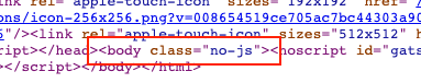 Rebuild the site (gatsby develop) and check the source code from the server again. This time you should now see a "no-js" class being served on the <body>: