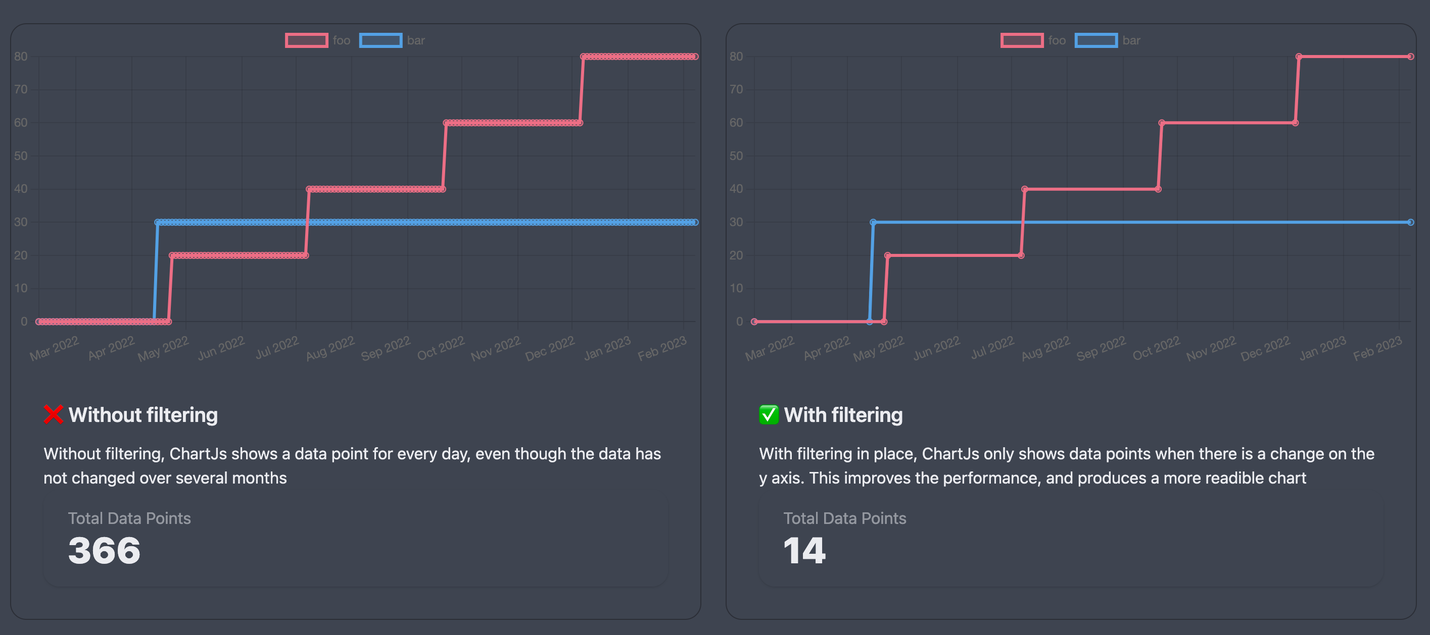 Wrapping the datasets with the filterData function will then input less data to the Chart component, and simplify the points displayed in the UI: